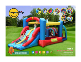 Castello gonfiabile Happy Hop mod. Nuovo Percorso Ostacoli Castello gonfiabile multiaccessoriato con doppio scivolo di media altezza, ampio trampolino salterello, area palline (30 in dotazione) per bambini più piccoli, canestro, ostacoli, doppio tunnel e arrampicata Ideale per una festa o un evento, sarete sicuri di sorprendere grandi e piccini! Ha la superficie extra robusta ed è molto sicuro grazie alle reti protettive su tutti i lati! Montaggio e smotaggio facile e veloce, si gonfia in meno di un minuto grazie alla pompa elettrica in dotazione Compreso di tutto e pronto all'uso Da chiuso dimensioni e peso ridotti Ottima qualità dei materiali, piccoli fori non impediscono l'uso Sicurezza garantita dalle reti protettive e dall'assenza di spigoli Un modo sano e naturale per far muovere i vostri bambini all'aperto Resistenza e durata garantite anche in presenza di strappi e fori Non allarmatevi se vi sono delle piccole perdite d'aria dai buchi delle cuciture o delle giunte dei nostri castelli, è del tutto normale! All'interno dei castelli sono presenti delle camere d'aria (inviibili dall'esterno) che garantiscono un flusso d'aria omogeno durante i salti dei vostri bambini. I castelli possono essere utilizzati anche con la presenza di fori larghi fino a un paio di centimetri creati da oggetti estranei, non vi è alcun pericolo, e potrete ripararli con le apposite pezze del kit di riparazioni in dotazione. Anche le cuciture possono essere semplicemente sistemate a mano con ago e filo resistente. Specifiche tecniche Dimensioni gonfiato: 530 x 250 x h215 cm Dimensioni scatola: 80 x 45 x h43 cm Peso: 30Kg Tempi di gonfiaggio: < 1 min. Materiale: PVC laminato e nylon Peso massimo consentito: 180Kg Potenza della pompa elettrica: 680W Accessori inclusi: 30 palline in plastica alta qualità, pompa gonfiante elettrica a bassa rumorosità, manuale in italiano, paletti per il fissaggio, kit di riparazione, borsa da trasporto in nylon, garanzia 2 anni. Certificazioni: GS, TUV, CE PERCORSO OSTACOLI Art. 9163 - Divertentissimo Gonfiabile Multigioco "New Percorso" Gonfiabile con un nuovo percorso ancora più ricco di ostacoli, con salterello, doppio scivolo e tanti altri giochi!! Con il salterello, la vaschetta di palline e il suo scivolo è adatta per far giocare in compagnia i bambini di tutte le età. Il gonfiabile viene fornito completo di: - 30 PALLINE IN PLASTICA DI CUI 2 IN VELCRO - MOTORE (POMPA DI GONFIAGGIO) - SACCA DA TRASPORTO - PICCHETTI PER L'ANCORAGGIO AL TERRENO - KIT DI RIPARAZIONE (anelli per il tiro a segno NON inclusi) Certificato GS, T?V, CE I castelli gonfiabili sviluppati per garantire un infinito divertimento per tutti. I gonfiabili Happy-Hop attirano sempre più genitori, offrono un facile sistema di gioco velocissimo da montare che permetterà ampio sfogo a tutti. Ogni modello è un mondo a sé con varie possibilità di svago, scivoli, saltarelli, canestri, palline, spruzzi... Tutti i gonfiabili HAPPY HOP garantiscono un elevato standard di sicurezza grazie alle apposite reti di protezione su tutti i lati, alle pareti più alte rinforzate, doppia cucitura sulle giunture e all? assenza di spigoli. I bambini possono saltare, scivolare e arrampicarsi in tutta sicurezza dando sfogo alla loro energia e voglia di giocare. La struttura interna è composta da camere d'aria che svolgono la funzione di garantire un flusso d'aria omogeneo su tutta la superficie del castello durante i salti e i giochi dei bambini. Piccoli fori (1-2 cm) NON compromettono l?utilizzo, non creano alcun pericolo e possono essere ripararti con l'apposito kit di riparazione incluso in ogni confezione. Scheda Tecnica Dimensioni: 530x250x215 cm Dimensioni Imballo: 80x45x43 cm Peso imballo: 30 kg Peso Max Supportato: 180 kg Altezza massima utente: 150 cm Età consigliata:anni 3+ Garanzia: 12 mesi