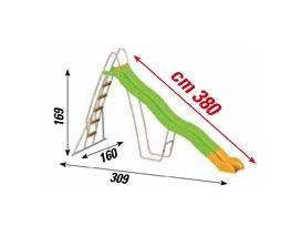 Struttura portante in metallo verniciato e zincato. Scivolo in plastica con onda centrale e terminale in colore diversificato. Dotato di scaletta con corrimano, gradini antiscivolo e rinforzo centrale in metallo. Dimensioni; cm 380 ? 217 ? 309 Dimensioni imballo; cm 199 ? 50 ? 40 Peso; 32 kg prodotti conformi alle norme di sicurezza europee EN. 71-1-2-3-8-9
