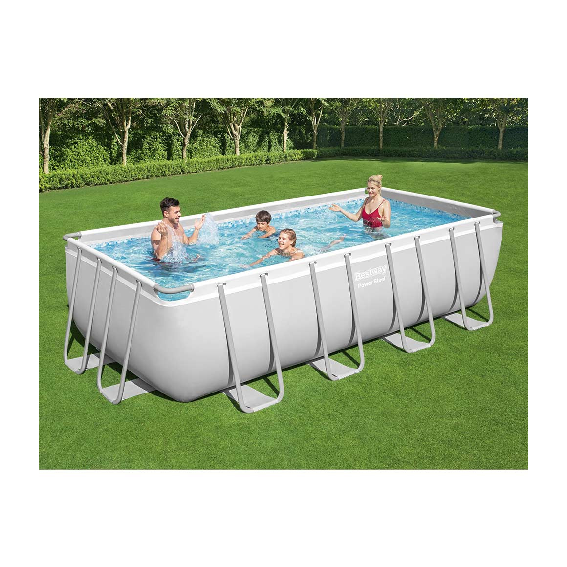 Piscina fuori terra Bestway 56670 rettangolare Power Steel Frame, struttura in metallo galvanizzato antiruggine, il telo che contiene l?acqua detto ?linear? è fatto col ?Triplex?, cioè un tessuto formato da tre strati così suddivisi PVC ? poliestere ? PVC, grazie a questa composizione il triplice strato garantisce una notevolissima resistenza.