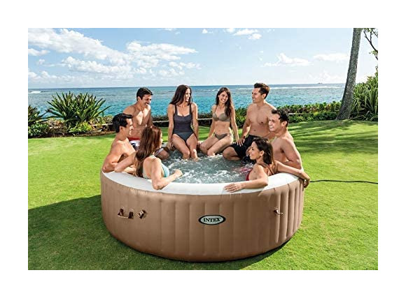 La Spa Intex 28412 è ampia, può contenere fino ad 8 adulti ed è dotata di maniglie per spostarla agevolmente, telo di copertura per mantenere l'acqua pulita e in temperatura, e di pannello di controllo per la gestione delle funzioni.