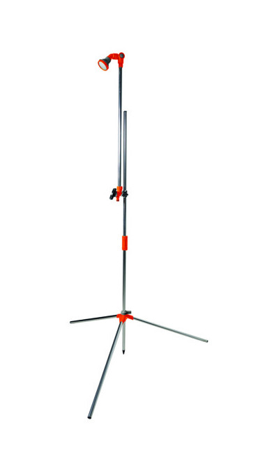 In alluminio, 3 sezioni completa di treppiede, puntale e rubinetto - Doccetta con snodo a 180° - Cf. in scatola Regolabile in altezza e direzione, possibile infilarlo su terra o metterlo con treppieide su pavimento |