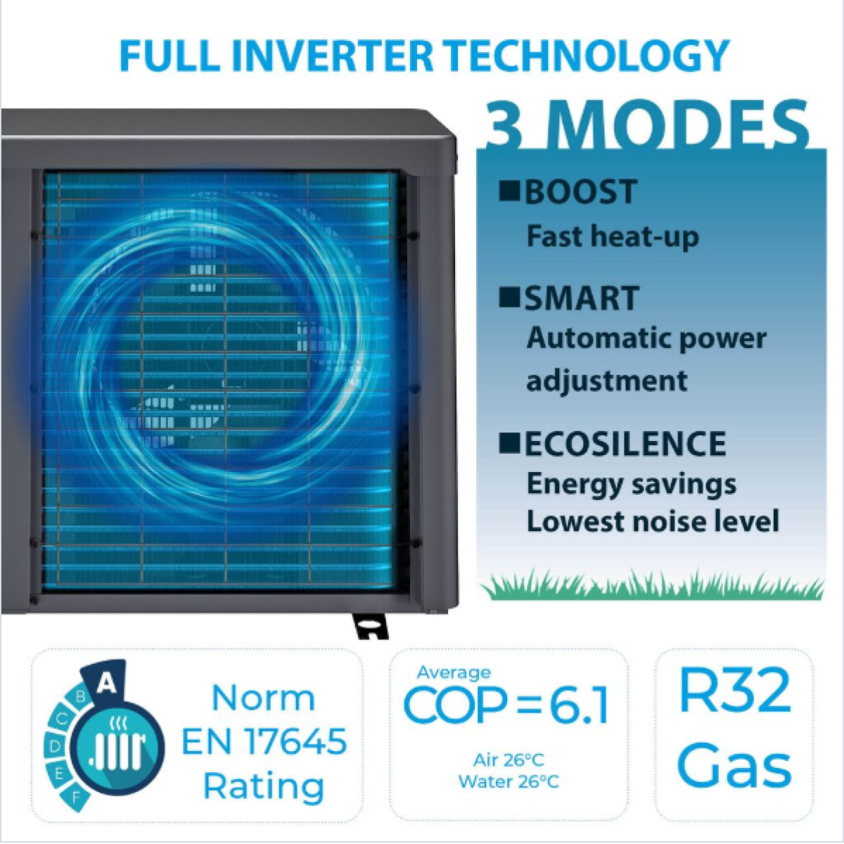 Utilizza l’aria esterna trasformandola in energia termica, garantendo alte prestazioni con consumi ridotti. Grazie alla tecnologia Full Inverter, la potenza viene modulata automaticamente per mantenere costante la temperatura dell’acqua senza sprechi.
