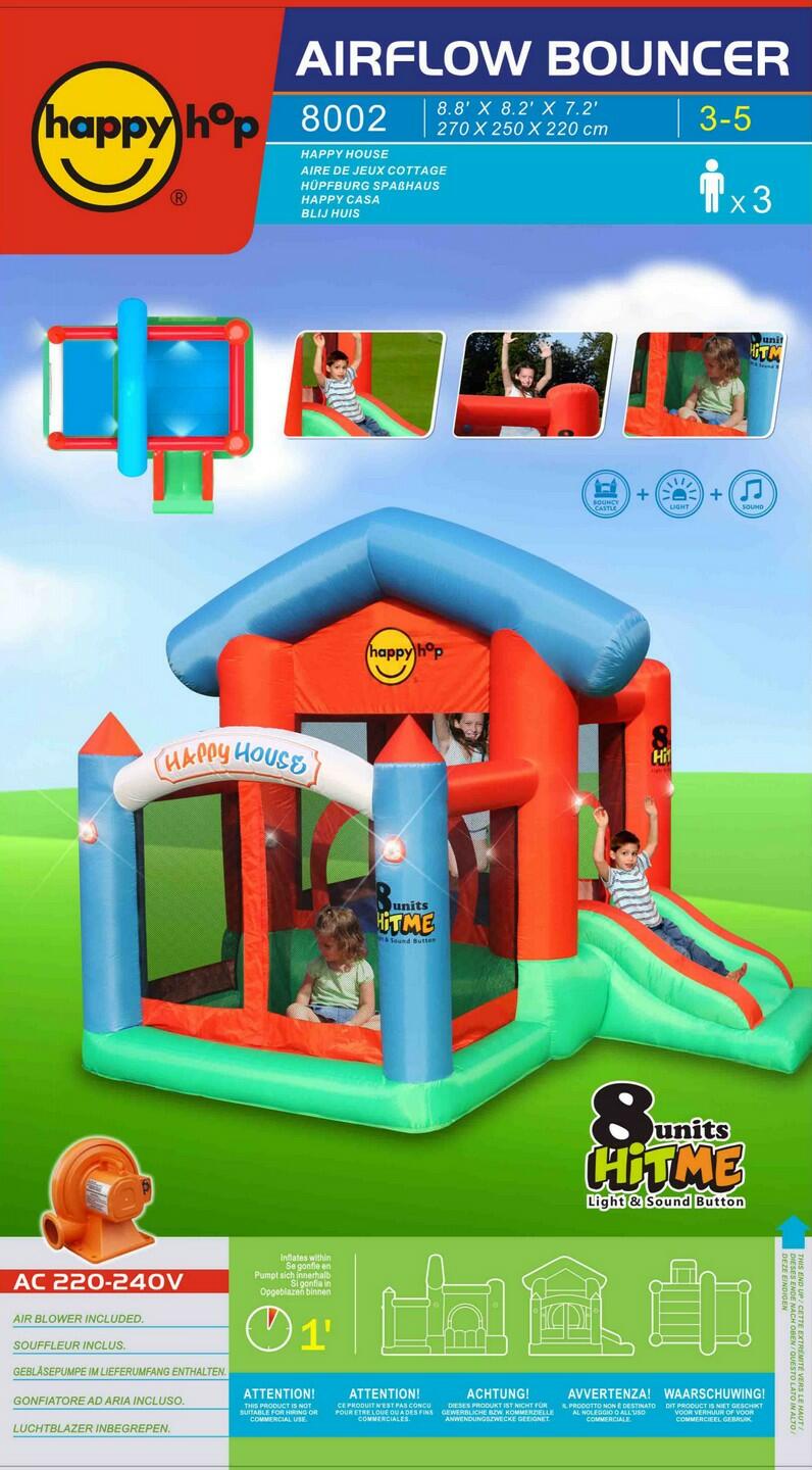 Novità del marchio Happy HOP, la linea di mini gonfiabili interattivi HITME con pulsanti per le luci e la musica!!! Happy House è la versione interattiva HITME dell'Happy Casa, con il salterello, la vasca palline e il suo scivolo, il tutto unito alla musica e alle luci colorate per un divertimento assicurato! Dotato di 8 pulsanti che si possono inserire negli appositi spazi distribuiti sul gonfiabile. Per ogni pulsante sono necessarie 3 batterie AAA che NON SONO INCLUSE. IL GONFIABILE VIENE FORNITO COMPLETO DI: - Motore - Sacca da trasporto - 30 palline in plastica - Picchetti per l'ancoraggio al terreno - Kit di riparazione - 8 pulsanti (premere i tasti ON/OFF per accendere e spegnere). La fuoriuscita d?aria dalle cuciture è del tutto normale, questo è necessario in quanto il gonfiabile viene gonfiato di continuo ed ha necessità di espellere l?aria per non sovraccaricarsi.