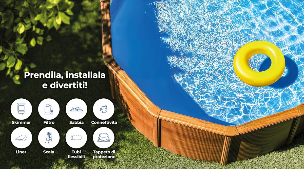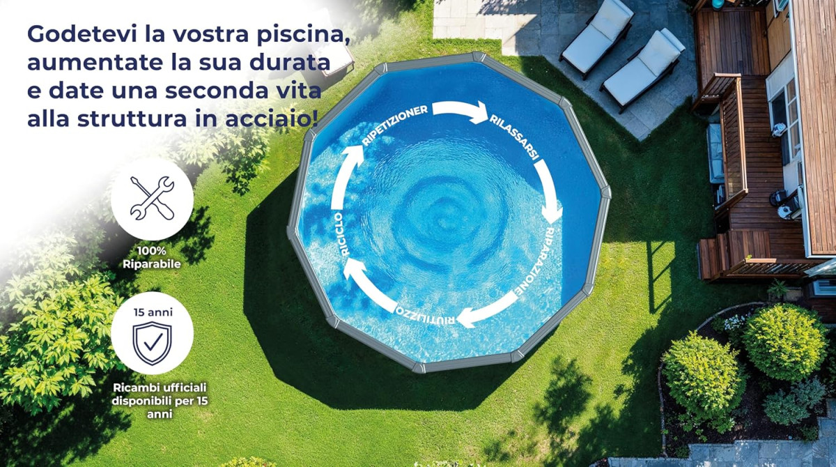 La piscina fuori terra Mauritius rotonda Ø460x132 cm è la scelta ideale per chi desidera una piscina solida, elegante e poco ingombrante, perfetta per rilassarsi e divertirsi durante l’estate.