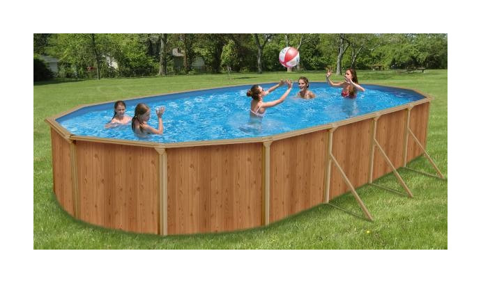 Piscine componibili in acciaio ?simil legno? ondulato e preverniciato con uno speciale trattamento anticorrosivo. Vasca in PVC K80 H.Q. trattato anti UV ed antialghe. Montanti in metallo ad alta tenacità e bordo superiore da 20 cm per conferire robustezza e comfort alla piscinaLa piscina è ovale con dimensioni 610?370 per un volume complessivo di 22 metri cubi di acqua e un? altezza di 132 cm.