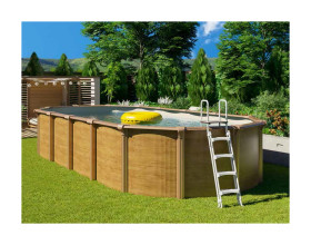 Piscina componibile in acciaio simil legno ondulato e preverniciato con uno speciale trattamento anticorrosivo.