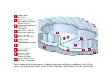 Gli elementi che costituiscono la piscina sono collegati tra loro con profili prodotti con speciali materiali, che conferiscono una particolare robustezza e rigidità. Le piscine vanno posizionate in uno scavo di fondazione appositamente predisposto e rifinite con i materiali di rivestimento più appropriati.