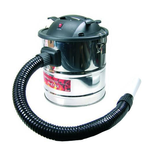 Aspiracenere phenix con doppio isolamento, dotato di un filtro TNT, 1 bocchetta in alluminio per aspirazione e di un tubo flex ø mm.44 lunghezza cm.130. Il fusto in acciaio inox ha un bocchettone di entrata aria ed un coperchio in plastica colore nero ì. La valvola di protezione è a depressione per impedire il surriscaldamento del motore in casi di filtro intasato o bidone pieno.