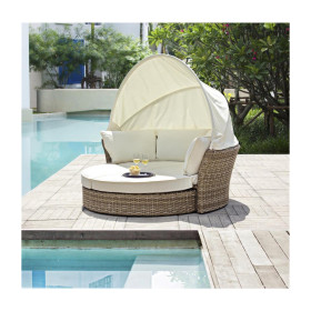 Daybed dall'accogliente forma rotonda, che può essere utilizzato come divano oppure come letto per trascorrere delle giornate di relax in giardino, grazie al poggiapiedi rotante a scomparsa e la cappottina richiudibile.