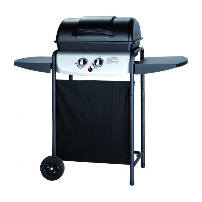 Barbecue YUMA. Griglia smaltata cm. 49 ? 32. Bruciatori in alluminio a gas a fiamma stabilizzata. Potenza 4,9 kw. Accensione piezoelettrica. Coperchio in acciaio verniciato. Piani laterali in acciaio. Telo anteriore in tessuto. Con 2 ruote.