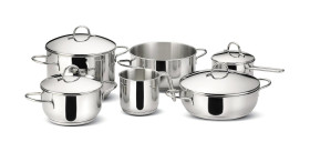 Nella linea Grancucina, interamente realizzata in acciaio inox 18/10, l'alta qualità e la massima cura dei particolari si associano ad uno stile elegante e ad elevate prestazioni di cottura e durata. Il fondo incapsulato LAGOSEAL PLUS a tre strati (acciaio-alluminio-acciaio) è adatto ad ogni piano di cottura e favorisce una perfetta diffusione del calore, riducendo al minimo il rischio di attaccamento dei cibi. La lucidatura a specchio all'esterno e la satinatura interna garantiscono massima igiene e facilità di pulizia. La forma robusta ed ergonomica di manici e maniglie, realizzati in ovaletto di acciaio, permette una presa salda e sicura. La gamma comprende articoli classici per tutti i giorni e per tutti gli usi. Composta da: pentola cm.22, casseruola fonda due maniglie cm.18, casseruola fonda due maniglie cm.22, casseruola bassa due maniglie cm.24, casseruola fonda a manico lungo cm.14, bollilatte cm.12, coperchio cm.14 /18/22/24.