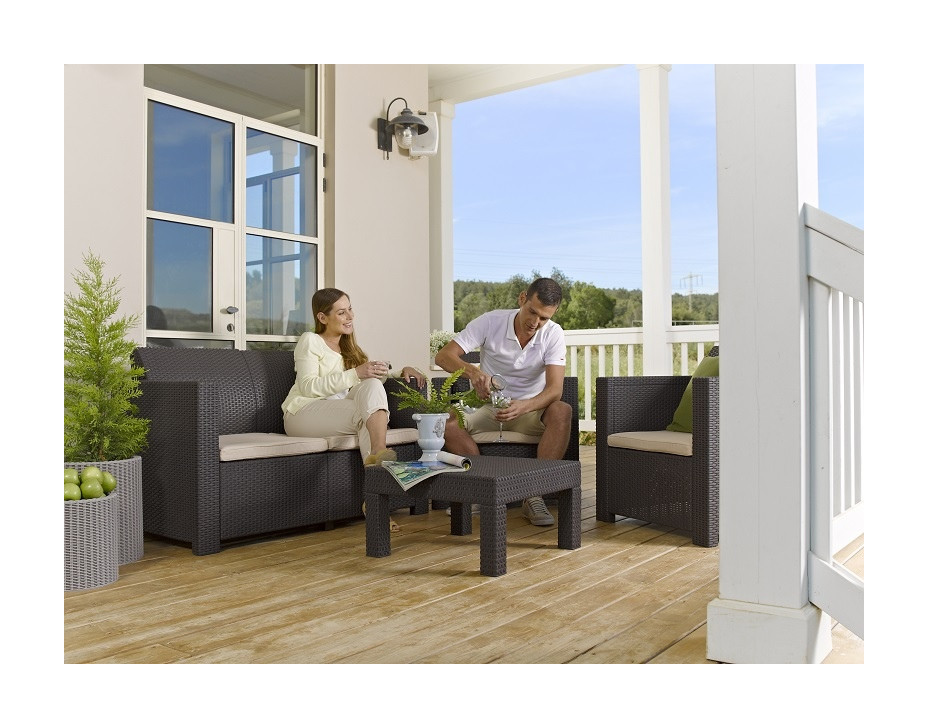 Set da giardino della Keter mod. Colorado Bellissimo Salottino del famoso marchio italiano Keter, composto da divano a due posti, due comode poltrone e tavolino. Completa il tutto cuscini nel colore scuro. Il prodotto viene spedito da assemblare: 1 Divano 3 posti. misure:cm 2 Poltroncine misura cm Tavolino rettangolare cm peso: 50 kg colori disponibili antracite cuscini sfoderabili di cotone